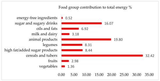 In the assessment of dietary patterns, estimated average total energy intake was 1320.1 ± 724.1 kcal/participant. Energy derived from the mean intake of 45.5 ± 33.8 g of protein, 48.3 ± 33.4 g of fat, and 181.8 ± 97.7 g of carbohydrates, while fiber consumption was 18.3 ± 14.9 g. In reference to the nutrition guidelines on the macronutrient composition of diets for healthy adults, the contribution of fat to total energy is slightly high at 31.7% (adequate intake is 25–30%), while carbohydrate and protein are within the recommended intervals at 55.2% and 13.1%, respectively (data not shown) [67]. Tortillas, bread, potatoes, rice and other cereals contributed 32.42% of total energy derived from foods, followed by animal products (mainly beef, cheese, chicken, and pork) (19.80%), sugar and sugary beverages (16.07%), ultra-processed foods with high added fat/sugar (8.44%), beans, lentils, and chickpeas (8.31%), oils and fats (6.92%), milk and yogurt (3.18%), fruits (2.98%), and vegetables (1.36%) (Figure 6) (see the Appendix for examples of foods in each category).