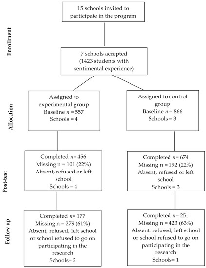 A RCT design was used with a control group and an experimental group. Fifteen state high schools from the cities of Seville and Córdoba (Andalusia region) were randomly selected by the Educational Authority using a simple randomization procedure (a list of random numbers was generated following a computer-based program). Those numbers that coincided with the school identification numbers were picked for the study. Following approval from the Research Ethics Committee of the Autonomous Region of Andalusia (code: 0575-N-14), initial contact was made with all 15 schools in December 2015. All schools presented a medium economic, social and cultural level (ISC Index in Spain) in accordance with the ranking established by the autonomous region’s education authority. Meetings were held with the schools’ directors and counseling teams to inform them about the research, its objectives, its content and the procedure to be selected for the experimental or control groups. Seven out of 15 schools agreed to take part in the study. Informed consent forms were signed and the program details were forwarded to the families and school boards, the latter granting all centers permission to take part. The seven centers were randomly assigned to either an experimental or control group using a coin toss procedure. A member of the research group who was not in direct contact with the school did this work. The waiting list procedure was applied to the control schools that expressed interest in receiving intervention in future editions. Pre-test was carried out in January 2016, post-test in June 2016, and follow-up in December 2016. The intervention took place from February through May 2016 once a week during school hours. Anonymous self-report, paper-and-pencil questionnaires were administered in the three waves. In order to identify students at the three points in time, the names of the participants were linked to a code that was used in each wave. The code was created taking into account the school, the class, and the number of each student in his/her class (the class list having been sorted alphabetically). Data were collected during school hours. Students received no rewards or incentives for taking part.