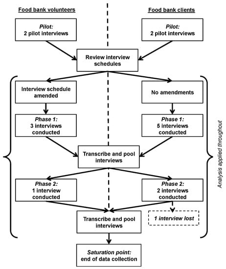Interviews took place immediately after recruitment in quiet, public areas of each outlet to ensure interviewer and interviewee safety. Interviews were audio-recorded using an Olympus (DS-3500) encrypted digital recorder, and recruitment continued until theoretical saturation was reached for the entire sample through the repetition of responses [] (see Figure 1). All interviews were transcribed verbatim, and an interview diary was used to collate observations about outlets and individual participants to support data interpretation []. Food bank clients received a £10 shopping voucher in gratitude for their participation, despite the risk that this might bias recruitment [].