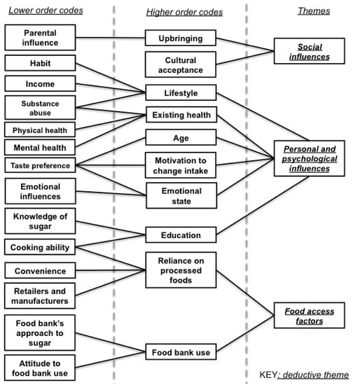 At a time where overweight and obesity are critical public health issues, it is easy to forget the almost contradictory challenge of increasing food insecurity for certain populations in the UK []. Increasing food insecurity has been met with a rise in emergency food support [], often provided by food banks who issue food parcels at minimal or no cost []. A wealth of reasons forces an individual into food insecurity. In addition to low income and changes to social security [], debt, addiction, family breakdown, and low purchasing power also contribute to food bank usage [,]. Food bank clients also often face poor physical and mental health []. While there is mixed evidence for the dietary quality of food bank offerings [,,], their clients are uniquely placed to provide insight into LSES sugar consumption behaviours.