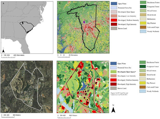 (A) Location of the study area (university) in the Southeastern USA with Greenville County in solid black, (B) Land use and land cover classification from the National Land Cover Database (NLCD 2011) for Greenville, SC, USA (black outline); purple polygon represents Furman University campus, (C) Aerial image of the campus (white outline), and, (D) campus scale NLCD 2011 image modified to show areas with <49% impervious surface (e.g., a golf course) as green space.