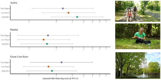 Adjusted ☨ Odds Ratios (95% CIs) for measures of well-being associated with students’ Active Use of Green Space, Passive Use of Green Space, and Overall Green-User Score. ☨ Odds ratios are adjusted for gender and race and students’ perceived “busyness”; High Active Use = physically active for ≥15 min in an on-campus off-campus green space ≥4 times per week; High Passive Use = sit, study, or eat for ≥15 min in an on-campus or off-campus green space ≥4 times per week; High Green User Score = Score of ≥30 on overall green user scale measuring frequency of time spent in outdoor activities.