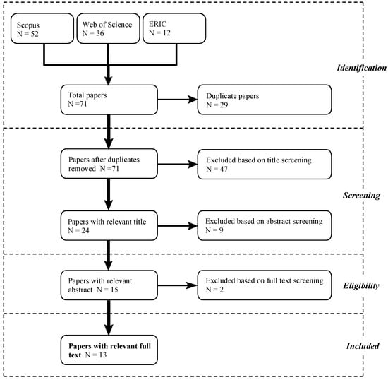 For this review, we followed the guidelines outlined in the Preferred Reporting Items for Systematic Reviews and Meta-Analyses (PRISMA), which provides rigorous standards for performing and reporting systematic reviews [31]. This protocol describes four steps in the selection of empirical articles: identification; screening, which involves reading titles and abstracts; eligibility, involving reading the full texts; and inclusion (Figure 1).