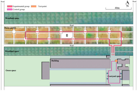 The research was conducted in the peony garden (Figure 1), which was surrounded by four roads. The peony garden had roads, seats, a rest square, and a number of tree peony cultivars. It was 215 m long (east–west) by 30 m wide (north–south) and covered an area of approximately 0.67 ha. The tree peonies were approximately 8–10 years old [44]. The height of the trees was 0.5 ± 0.1 m, and the number of blooms per tree was 18 ± 6. This study was conducted separately at the exhibition leaf stage (ELS), initial bloom stage (IBS), full bloom stage (FBS), and terminal bloom stage (TBS). The leaf buds of the whole tree were basically expanded at the exhibition leaf stage. Most peony petals were slightly opened, but a few had already opened and were at the initial bloom stage. The peony petals were all opened to the maximum extent at the full bloom stage. Most of the peony petals began to fade at the terminal bloom stage [44]. The morphological characteristics of peony flowers were shown in Figure 2. During the peony-viewing program, there was no rain and the weather was pleasant with a temperature of 22.7 ± 1.6 °C, a relative humidity of 54.3 ± 2.5%, and a wind speed of 1.5 ± 0.3 m/s. In addition, the roads around the peony garden were closed for traffic by the campus managers to keep a good environmental condition for the experiments.
