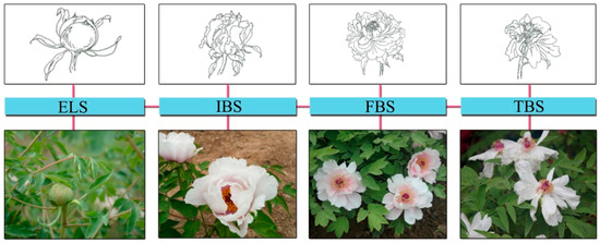 Morphological characteristics of peony flowers at the different stages. ELS: exhibition leaf stage, IBS: initial bloom stage, FBS: full bloom stage, and TBS: terminal bloom stage.
