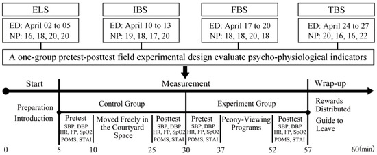 The experiments were conducted when the tree peonies were at the exhibition leaf stage (ELS), initial bloom stage (IBS), full bloom stage (FBS), and terminal bloom stage (TBS), severally, from 9:00 am to 12:00 pm on 2–27 April 2018. Four tests were carried out at each phenological stage, respectively (Figure 3). The participants gathered at a designated location. Before the start of the experiment, the participants were allowed to move freely in the courtyard space (with hard pavement, a stone table, and several buildings, but without peonies (Figure 1)) for 15 min [16]. Their pre- and post-psycho-physiological indicators were recorded, and they were treated as a control group. Then, all participants took part in the experiment in a prearranged order and entered the peony garden to watch tree peonies. Their pre- and post-viewing physiological and psychological indicators were recorded. A guided 15-min peony-viewing program was organized to include the major stimulation of two senses, namely, vision (e.g., peony leaves, flower colors) and olfaction (e.g., the volatiles of peonies). During this process, subjects were allowed to touch the tree peonies, but not to talk with others, look at the phone, and walk out of the peony garden. Each participant walked for approximately 300 m in the peony garden. The specific steps are as follows (Figure 2).