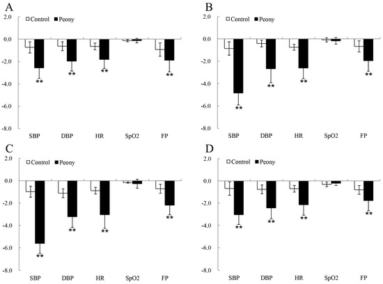 The pre- and post-viewing changes of participants’ physiological indices in the experimental (peony) and control groups at (A) ELS (exhibition leaf stage), (B) IBS (initial bloom stage), (C) FBS (full bloom stage), and (D) TBS (terminal bloom stage). SBP: systolic blood pressure, DBP: diastolic blood pressure, HR: heart rate, SpO2: blood oxygen saturation, and FP: fingertip pulse. N = 74, mean ± SD. ** p < 0.01, paired-sample t-test.
