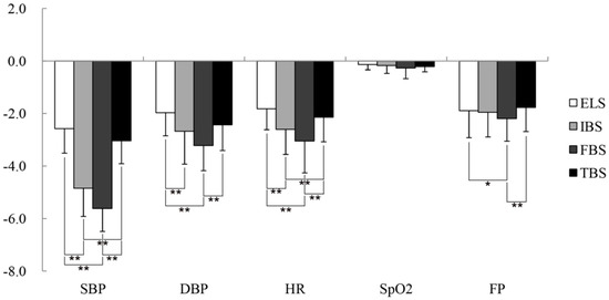 Comparison of physiological index changes among the experimental groups. ELS: exhibition leaf stage, IBS: initial bloom stage, FBS: full bloom stage, and TBS: terminal bloom stage. SBP: systolic blood pressure, DBP: diastolic blood pressure, HR: heart rate, SpO2: blood oxygen saturation, and FP: fingertip pulse. N = 74, mean ± SD. * p < 0.05, ** p < 0.01, one-way ANOVA.
