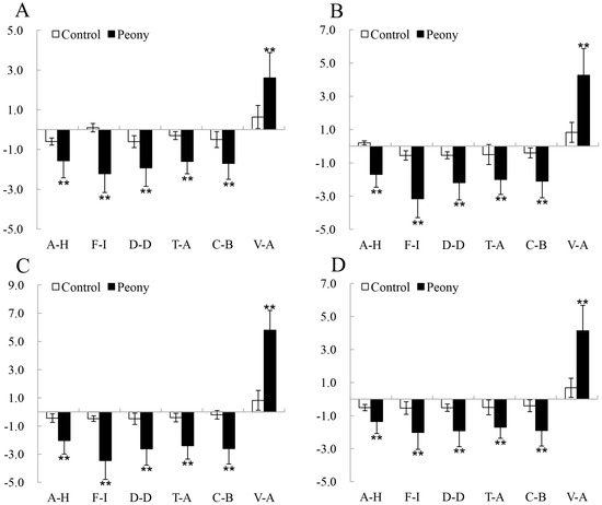 The pre- and post-viewing changes of POMS scores during the experimental (peony) and control groups in the (A) ELS (exhibition leaf stage), (B) IBS (initial bloom stage), (C) FBS (full bloom stage), and (D) TBS (terminal bloom stage). A–H: anger–hostility, F–I: fatigue–inertia, D–D: depression–dejection, T–A: tension–anxiety, C–B: confusion–bewilderment, and V–A: vigor–activity. N = 74, mean ± SD. ** p < 0.01, paired-sample t-test.