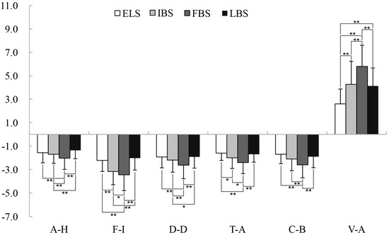 Comparison of POMS scores among the experimental groups. ELS: exhibition leaf stage, IBS: initial bloom stage, FBS: full bloom stage, and TBS: terminal bloom stage. A–H: anger–hostility, F–I: fatigue–inertia, D–D: depression–dejection, T–A: tension–anxiety, C–B: confusion–bewilderment, and V–A: vigor–activity. N = 74, mean ± SD. * p < 0.05, ** p < 0.01, one-way ANOVA.