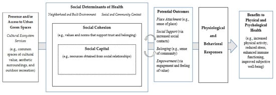 Given these points, it is important to not overlook the role of social connectedness as an element of social cohesion that is crucial to health, particularly as it relates to urban green spaces. For example, after adjusting for sociodemographic characteristics, Maas and colleagues [85] analyzed the social mechanisms between green space and health in the Netherlands and found that residents with less access to green space had a greater perception of loneliness and limited social support. Figure 1 provides a conceptual framework to illustrate the relationship between cultural ecosystem services from urban green spaces and social cohesion with related social and health outcomes.