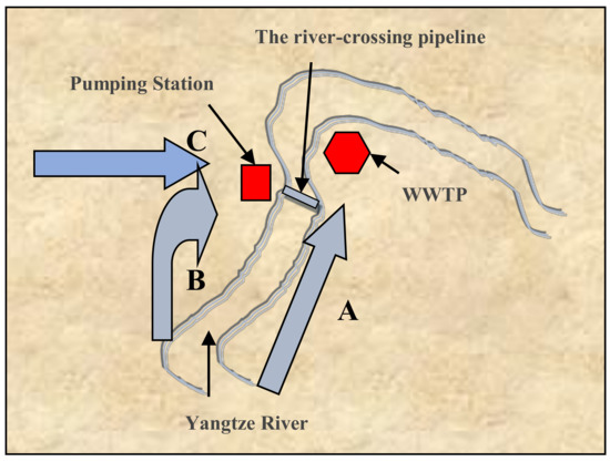 The selected WWTP is located in Chongqing city (China) with a combined sewage collection system. The WWTP provides wastewater treatment services for three nearby districts, including Nan’an District, Jiulongpo District, and Yuzhong District (see Figure 1). The wastewater from Nan’an District enters the WWTP directly through Route A; and the wastewater from Jiulongpo District and Yuzhong District is channeled to the pump station through the Route B and Route C, respectively. During rainy days, the pumping station regulates the flow by controlling the number of sewage pumps. The wastewater collection route is shown in Figure 1. The treatment capacity of the WWTP in dry and rain seasons is 60,000 m3/d and 100,000 m3/d, respectively. The inverted anaerobic-anoxic-oxic (AAO) process is used, and the flow chart is shown in Figure 2.