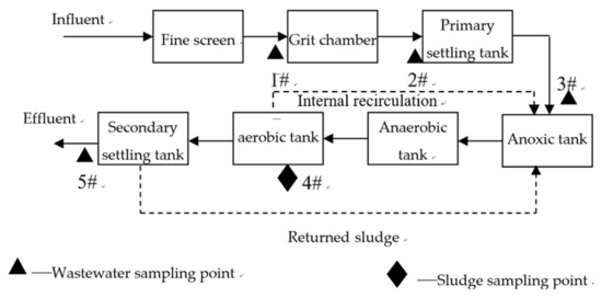 Schematic diagram of WWTP and sampling locations.
