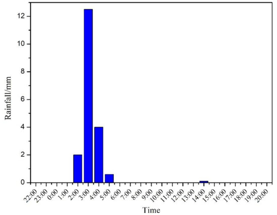 On 29 May, the rainfall mainly occurred between 2:00 and 4:00; while the hourly rainfall hit a peak of 12.5 mm at 3:00 (see Figure 3). According to the U.S. Geological Survey (USGS) definition of individual rainfall events, this rainfall can be categorized as heavy rain, and the surface erosion rate was greater than or equal to 90% [18]. Prior to this rainfall event, it had been dry and sunny over the past 15 days. Therefore, the surface runoff generated by this heavy rainfall event should be representative in the current study.
