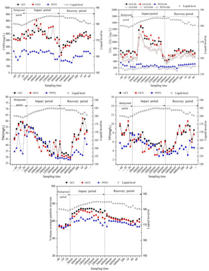 The influence of surface runoff on the combined wastewater was mainly reflected in two aspects: firstly, the scouring effect caused the increase of pollutant concentration; secondly, the dilution effect of rainwater on domestic sewage. The concentrations of COD and TSS and ISS during the initial rainwater were higher while the concentrations of TP and TN were relatively low [22]. Therefore, when the surface runoff entered WWTP, the concentrations of COD, TSS, and ISS first reflected the scouring effect of initial rainwater and then reflected the dilution effect of surface runoff [23]. The effects on TN and TP were primarily dilution [24]. After the rainfall started, the average volume diameter of the influent from the grit chamber increased from 54.4 μm–71.9 μm, with the maximum value appearing at 80 min. This indicates that the concentration and particle size of suspended solids washed into the WWTP peaked at the same time when the surface runoff peaked.
