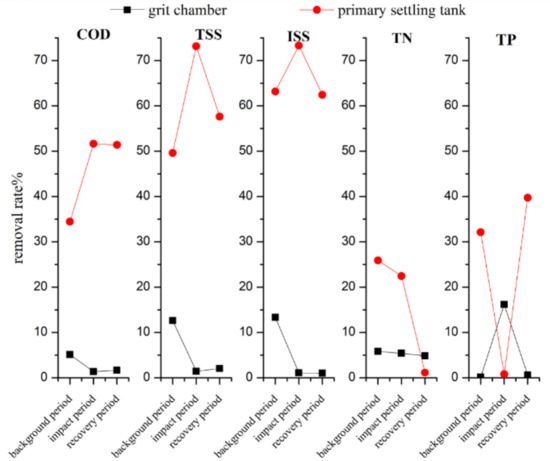 Surprisingly, the primary sedimentation tank demonstrated very good impact resistance during the impact period. In this period, the removal rates of COD, TSS, and ISS in the primary settling tank escalated from 45.64%, 49.59%, and 63.25% to 51.52%, 73.12%, and 73.27%, respectively. According to the data in Table 1, it can be found that the removed concentration of TSS by the primary settling tank was 298, 710, and 372 mg/L during the background period, impact period, and recovery period, and the ISS removal concentration was 284, 551, and 348 mg/L, respectively. These results show that the primary settling tank ordinarily has the same performance on TSS and ISS removal, but it does remove 149mg/L of VSS during the rainfall event. Combined with the increase of the COD removal rate, it can be inferred that the primary settling tank aggravates the removal of organic carbon in sewage during rainfall, which has a negative impact on subsequent biological treatment.