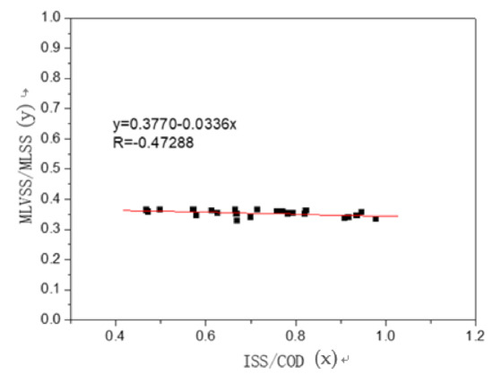 The correlation analysis between the MLVSS/MLSS ratio of the mixed liquor and ISS/COD ratio of the primary sedimentation tank effluent is shown in Figure 7. The R value was a linear correlation.