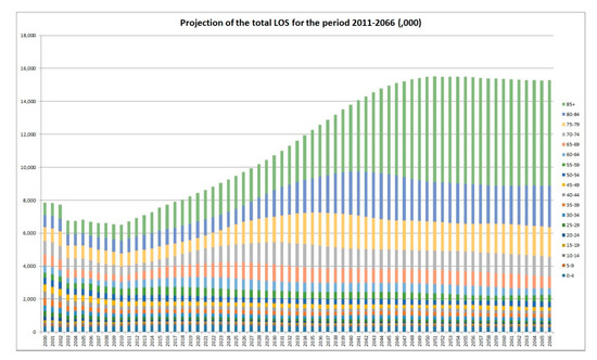 Total days of hospitalisation: 2000–2066. LOS: length of stay.