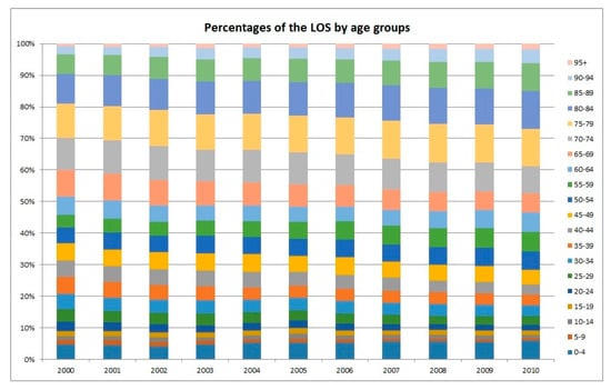As illustrated in Figure 3, the projected increase in the TLOS for the older age groups would be more prominent and the peak would appear later. For example, it is projected that the LOS of the age group 65–74 would peak in the year 2031 while the corresponding figures for 75–79, 80–84, and 85+ would peak in 2041, 2046, and 2056, respectively. Moreover, Figure 4 shows the trend of the LOS in the five-year age groups (in total 17 such age groups plus the group of 85+) from 2000 to 2010. It agrees with the obvious shifting of the weights to the older ages, in particular, to the oldest ages. It is a good complement to Figure 1 in demonstrating the impact of ageing on the LOS. The stacked column chart, Figure 5, visualizes the percentage proportions of the 20 age groups from a different angle. Again, the trend of ageing is clearly shown from the top section of the graph. For the group 75+, its share in the total LOS increased from 29.7% in 2000 to 38.8% in 2010; the share of 85+ increased from 9.6% to 15%; the share of 95+ increased from 0.85% to 1.77%. The older the age, the higher is the increase.