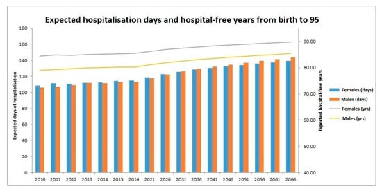 In addition, making use of the single-age data, a projection on , the expected total number of days an individual will spend in hospitals, HFYt, the expected total hospital-free time, from birth in year t to age 95, and for t = 2010, …, 2066 was performed. This projection was conducted for females and males separately with the following assumptions: