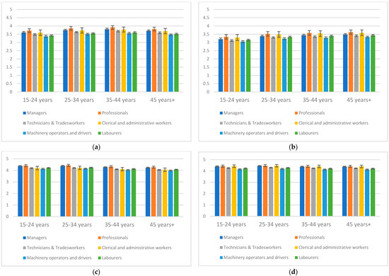 We also examined occupational skill level differences within each age group, noting that this information was not available for all participants (see Figure 1a–d, as well as Table S1 in Supplementary Materials).