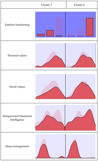 The first group resulting from the cluster analysis (Cluster 1) was characterized by low-moderate family functioning, mean scores below those found for the total sample in personal and social values, and similar to the sample mean interpersonal factor and stress management. While in the second cluster, with high family functioning, the mean scores were higher than the whole sample for personal and social values with scores near the sample mean in interpersonal and stress management.