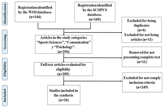 All research published in either the English or Spanish languages were considered, resulting in a total of 313 studies being obtained for further examination. In order to specify the theme of the work, the research domains “Sport Sciences”, “Communication” and “Psychology” were targeted, with other less relevant areas to the study objective being disregarded. After refining the literature search, the final study sample was selected according to the following inclusion criteria: (i) studies in which at least one means of communication was used to spread information; (ii) designed to address the types of influences exerted by the media; (iii) included media designed to address the public; and (iv) used a cross-sectional or experimental research design.
