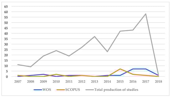 The production of articles dealing with the topic analyzed has ascended over the last decade, reaching its highest point in 2017 (n = 58) when most articles were published, followed by 2016 (n = 43). The greatest decline in publication of relevant articles is detected in 2008 (n = 9), though 2014 (n = 23) should be acknowledged as a year in which interest in the topic decreased as publications relating to the topic had been high prior to this year.