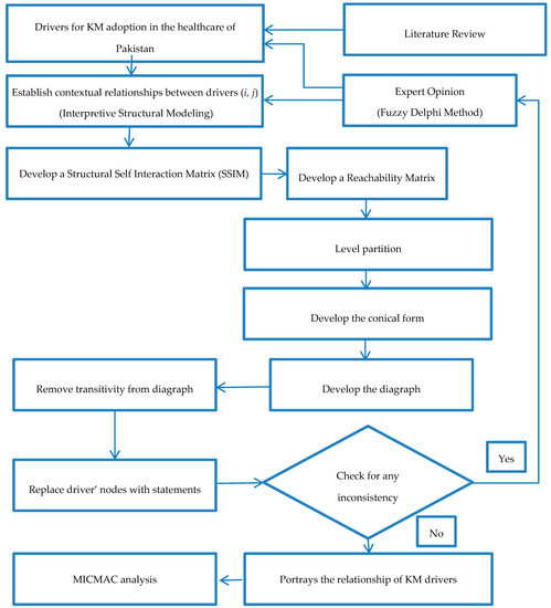 Among the developing countries, Iran has worked the most on adoption of KM in its healthcare sector [17,18,19]. Pakistan, being influenced by Iran, has also shown great interest in KM implementation in its public and private hospitals. Currently, KM implementation is in its infancy. The healthcare of Pakistan has suffered greatly due to increase in diseases [20], population growth [21], limited resources [22], and performance issues [23], and is now looking towards KM to resolve these issues and to improve performance. Therefore, the objective of this study is to identify the drivers of KM in the healthcare industry of developing countries in the context of Pakistan. This study was considered for four main reasons; firstly, there is scarcity on literature related to KM implementation in the healthcare sector, specifically in developing country e.g., Pakistan. Secondly, most of the earlier studies focused on the KM implementation in private and profit oriented businesses, however, the non-profit and public oriented organizations such as hospitals (healthcare) lacks the literature on KM implementation [24], which is one of the major contributions towards the KM literature. Thirdly, despite the multiple benefits attached to KM, drivers to promote KM are not extensively discussed in the healthcare. Fourth, drivers to KM implementation need to be discussed through scientific research and with an established methodology. This study employs the Fuzzy Delphi Method (FDM) to shortlist the drivers collected from extensive literature review and then applies the Interpretive Structural Modeling (ISM) technique for developing the relationship between different drivers and represents them in a hierarchical form [25].