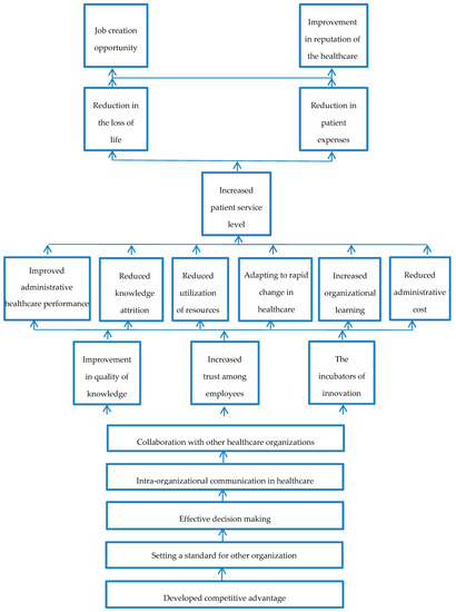 Most of the healthcare sector organizations of developed countries, America, Canada, Europe, etc. have already shifted towards KM to increase collaboration and sharing of information to make healthcare organizations sustainable and able to provide optimal healthcare performance [10,12]. The performance is improved by coordination and cooperation of several partners in recording and transmission of daily healthcare activities knowledge. There is a great reliance on knowledge and evidence-based medicine (EBM) in the healthcare sector [14]. EBM helps the public healthcare sector organizations in optimized decision-making based on evidence from well-defined and well-conducted data generated by knowledge, and it considerably improves performance. Goldsmith [15] mentioned that decision making in healthcare is very critical, it affects the patient care greatly. Other than performance, KM also increases the accountability of the healthcare organizations; the availability of information at the appropriate time reduces the chance of medical errors. These reduced medical errors result in fewer lawsuits [16]. After observing the positive changes brought about by KM in developed countries, some developing countries are also considering adopting KM in the healthcare sector.