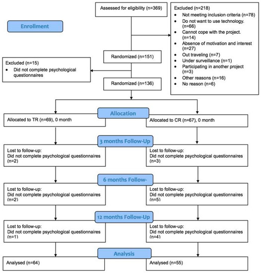 All included patients filled in a questionnaire at baseline on enrollment, and at 3, 6, and 12 months. The baseline measures were taken prior to engaging in the TR program, in which they were given several digital devices; the 12 weeks follow-up was filled in just after returning all the devices except the Fitbit, and the remaining two questionnaire packets were completed at 6 and 12 months, respectively. Non-responders were requested to fill in their questionnaires using a maximum of two reminders.