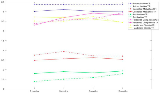 We used ANOVA with repeated measures of motivational factors in order to examine our first aim. We found an initial difference in autonomous motivation between the two groups, with the CR group showing higher levels of autonomous motivation over time (see Table 2 and Figure 3.). However, despite an initial increase in autonomous motivation in the TR group, the overall levels of autonomous motivation remained relatively stable over time across the two groups (F2.78 = 0.21, p = 0.88). In addition, both groups significantly improved their levels of perceived competence over time (F2.85 = 8.68, p < 0.01), but at comparable levels, indicating that both groups benefitted equally in terms of increased competence, irrespective of group allocation. No other analyses of the effects or interactions of motivational factors showed significant results (see Table 2).