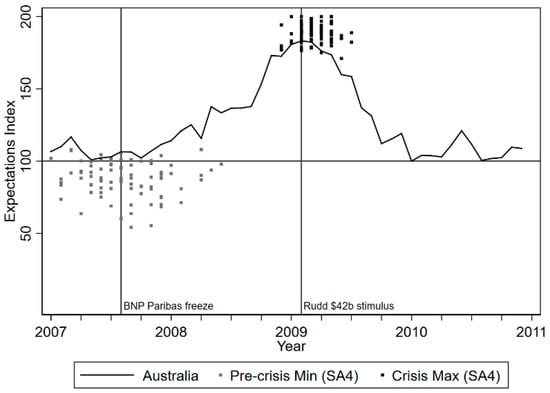 The solid line in Figure 1 plots the national unemployment expectations index for Australia over the period 2007 to 2011. It is evident that at the peak of the Great Recession, when Prime Minister Kevin Rudd released a AU$42b stimulus package, that unemployment expectations were also peaking. The index suggests that approximately four in five persons expected unemployment to increase over the next 12 months. Further, Figure 1 also plots the most optimistic expectations (minimum index) prior to the crisis and the most pessimistic expectations during the crisis (maximum index) for each labor market region. The most pessimistic community-level expectations were highly concentrated around the first quarter of 2009, while the most optimistic expectations were more dispersed over 2007–2008. The change in the index between the minimum and maximum represents each community’s “shock to expectations”. The mean change is 100 points, with a standard deviation (SD) of 13. This suggests that there were regions that experienced larger “shocks” to their expectations than others.
