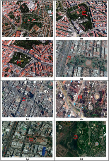 Urban Spaces in Lisbon and Bogotá cities. (a) Jardim da Estrela (LJES); (b) Jardim da Fundação Calouste Gulbenkian (LJFG); (c) Jardim do Príncipe Real (LJPR); (d) Autopista norte estación Alcalá (BOAPA); (e) Calle 19 con Cra. 7 (BOC197); (f) Fuente de agua edificio Tequendama (BOFAET); (g) Plaza de Lourdes (BOPL); (h) Simón Bolívar park (BOPSB).