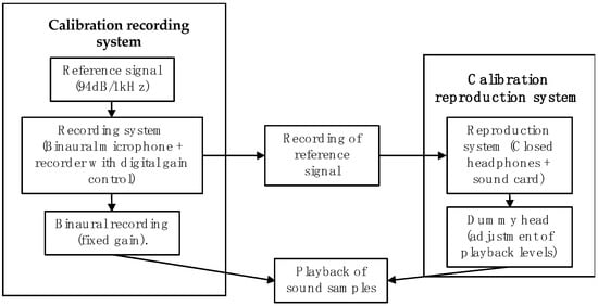 Calibration process diagram for the recording and reproduction of acoustic environments in laboratory test.