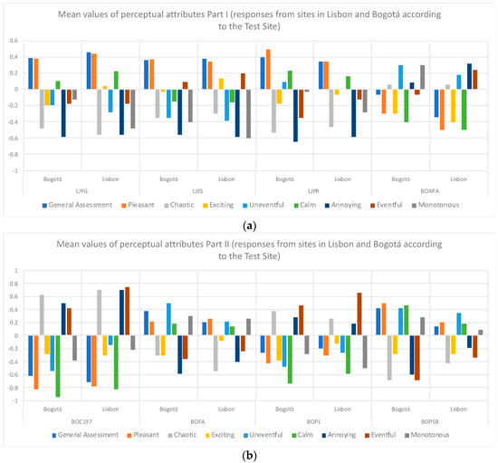 (a) Mean values of perceptual attributes Part I (responses from sites in Lisbon and Bogotá according to the listener’s Test Site); (b) Mean values of perceptual attributes Part II (responses from sites in Lisbon and Bogotá according to the listener’s Test Site).