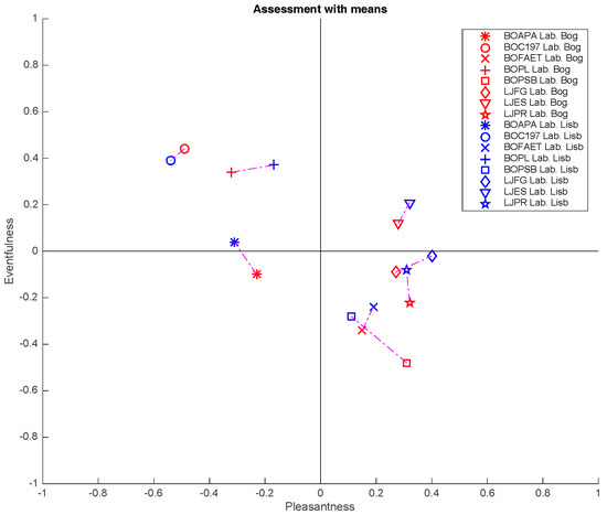 Figure 5 presents the Cartesian representation of the Axelsson’s model according to the evaluations carried out in Lisbon and Bogotá. One can see that, although small shifts are found in the x and y axes for the different places under study according to their Test Site, the shifts are not considerable. In fact, only one of the eight places under study (BOAPA) showed a slight change of quadrant, represented in the change of the main component Eventfulness.