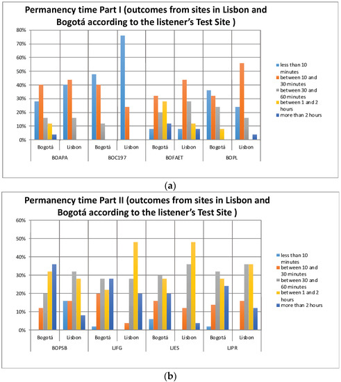 (a) Outcomes: permanency time of the listener according to test sites in Lisbon and Bogotá places (Part I); (b) Outcomes: permanency time of the listener according to test sites in Lisbon and Bogotá places (Part II).