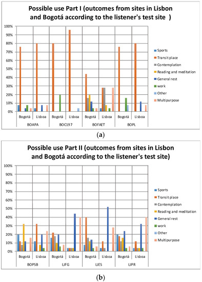 Likewise, it is interesting to see the emergence of sites that can be considered common or mainstream to any city (a highway or a water fountain, for example), since there is no association between the variables Possible Use and the Listener’s Test Sites, which means that its “meaning” is the same regardless of the Listener’s Test Site. It is here that the concept of “the non-place” arises and becomes relevant. A place can be defined as “an identity, relational and historical site” so that a space that “can not be defined either as an identity, relational or historical site is considered a non-place” [72]. Bringing this concept to the soundscape field, acoustic environments that do not represent or generate identity, evoke a memory or awake some sense of belonging in the listener can be considered as sonorous non-places. To delve into this concept, two out of the eight cases presented in this study will be shown: the BOAPA site (north highway of Bogotá) and LJES site (urban park of the city of Lisbon).