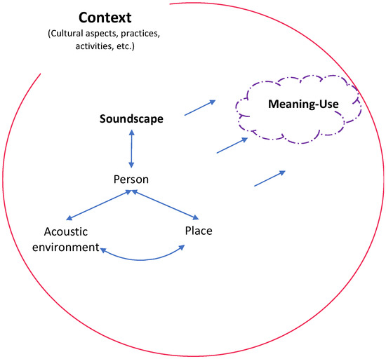 The process presented in Figure 8, establishes a connection between the Place, the Acoustic environment and the resulting Soundscape, and go in the same line of previous works, that indicate the need to relate the use of the spaces to the soundscapes [43,77]. Persons interact with places, so the acoustic environment is configured from the affordance place, the activities and practices developed. The soundscape is, therefore, a product of the interaction of Person with their Place and their Acoustic environment, which in turn feeds on the context and contributes to the meaning of places.