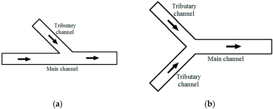 Two types of confluence channels: (a) Asymmetrical confluences; (b) Y-shaped confluences.