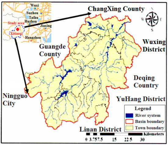 Eight representative channel confluences in Xitiaoxi watershed served as the study sites for the research. The Xitiaoxi river basin, one of the most important tributaries in the Lake Taihu Basin, is a typical dendritic river network (see Figure 2). It is located in Huzhou city, Zhejiang province, and supplies water for residents’ daily living. The classification and morphological analysis of the river network indicate that many confluences exist in Y-shaped form of the Xitiaoxi river basin. Natural confluence river intersection angles ranged between 30° and 90°, with a statistical average of 60°.