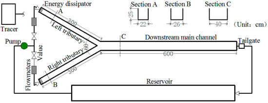 A type of flume with a symmetrical confluence was used to perform hydrodynamic disturbance and contaminant transport experiments. The experimental device was designed according to the results of the field investigation. This experiment was a basic investigation where the model and statistics were designed according to a scale of 1:250. According to the gravity similarity criterion, the generalized flat bottom flume fixed bed model was used for the test. The current study is concerned with results of a 60° confluence angel, although the natural confluence river intersection angles ranged between 30° and 90°. The two tributaries were 22 cm and 26 cm wide, respectively, and 3 m long, while the post-confluence channel was 40 cm wide and 6 m long (see Figure 3). It is common for the post-confluence channel to be slightly wider than the branch channel at natural river confluences, a phenomenon referred to as “downstream hydraulic geometry” [32]. This experiment was carried out using a flume that is awaiting national invention patent of China approval (No. 201810287680.8).