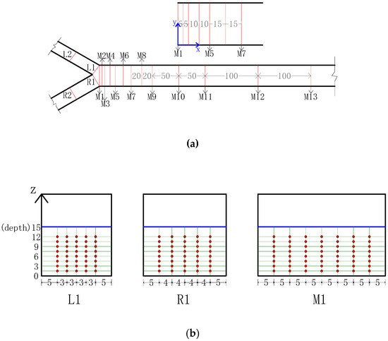 A Vectrino acoustic Doppler velocimeter (ADV) was used to measure three-dimensional flow velocities at a series of grid-defined points, which were taken in lines at 13 cross sections (M1–M13), with the near bed locations being more closely spaced as shown in Figure 4a. Each channel cross section consisted of seven evenly spaced vertical profiles, as shown in Figure 4b. In each line, the lowest measurement point is located at 1.5 cm above the bed due to the measuring requirements of the ADV, and other points are located in the line with a vertical interval of 1.5 cm. This testing grid produced approximately 888 velocity measurement locations for each flow condition studied. The velocity measurements were taken at each sampling location for 30 s at a sampling rate of 50 Hz.