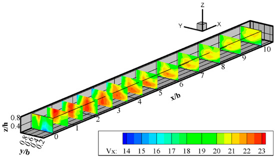 The longitudinal velocity vx is the dimension velocity in the x-axis measured in cm/s. Figure 5 displays longitudinal velocity contours along the downstream main channel for q = 0.5. The flow velocities were relatively large in the middle and lower layers, whereas they were relatively small in the near surface layer as a result of the lateral momentum being greater near the surface than near the bed. In this study, several basic flow characteristics can be found from the distribution of velocity components in the cross sections. The low velocity zone can be seen as the area of relatively lower velocity along the junction-adjacent wall downstream of the channel junction. Adjacent to the low velocity zone is the velocity acceleration zone resulting from the contraction of the two confluent flows by the low velocity zone. The maximum velocity can reach about 23.46 cm/s and this occurs just downstream of the junction at x/h = 2.5. At the interface of the two incoming flows is the shear layer, which is characterized by a velocity gradient caused by the velocity difference between the two incoming flows.