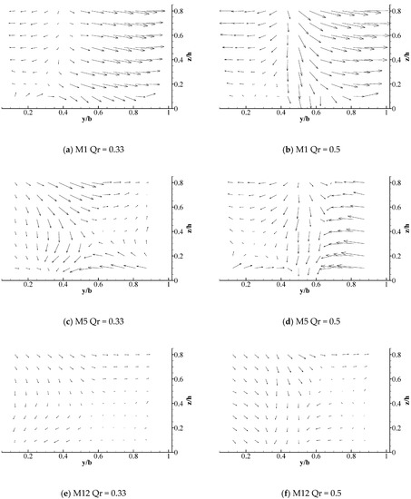 Two secondary currents in the opposite direction, which are initiated by the deflection of the symmetric tributaries collision, can be found in junction cross-section 1 (see Figure 6). The border between two symmetric secondary current can be observed at y/h = 0.45. The secondary current is gradually weakened along the downstream channel. Up to M12, the secondary current tends to disappear and the velocity becomes uniform. In addition, when the discharge ratio is larger, the flows in the left and right bank have a more uniform distribution, and the secondary current becomes more evident. A greater momentum with a larger discharge ratio in two branches results in a remarkable secondary current. This was due to the conflicting flow caused by the branches, and the two boundary conditions made the fluid produce two relatively symmetrical flows that deviated from the main flow direction.