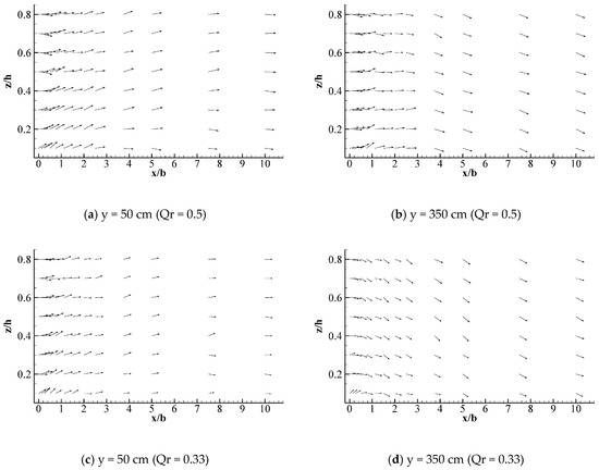 Figure 7a shows that the two water flow deflection zones are symmetrical when the discharge ratio is 0.5, which is consistent with the characteristics of the Y-shaped junction channel. After the intersection, the overall water flow deviation at z/h = 0.1 is contrary to that at z/h = 0.8, where the upper water flow is biased to the left bank while the lower water flow is biased to the right bank (see Figure 7). Figure 8 demonstrates that the water near the left bank flows downward, whereas the water flow near the right bank flowed upward. Therefore, the Y-shaped intersecting water flow comprised a double-spiral flow at the intersection, which was a counter-clockwise vortex toward the downstream. The rotation intensity decayed as the distance departing from the junction increased and the discharge ratio decreased.