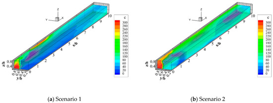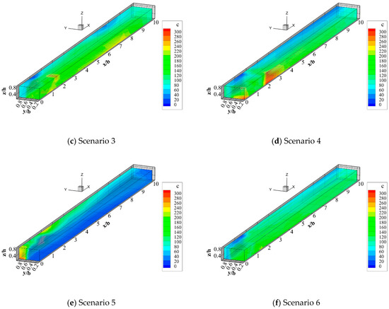 The distributions of contaminant concentrations when the pollution tracer is discharged from the line source are shown in Figure 9e,f. The water can also be separated into three parts, including the mixing layer at the interface between the clean and polluted water, the clean water, and the polluted water. When the discharge come from a line source, the contaminant concentration band after the intersection is first compressed and then diffused downstream, where the pollutant concentration region is twisted. The line source discharge from the left branch full-section produces a high concentration area near the left branch side of the mainstream after the intersection while discharge from right generates a low concentration area near the left branch side along the downstream area of the mainstream. The maximum concentration value shown in Figure 9e is greater than that in Figure 9f, but the overall concentration in Figure 9e is lower than that in Figure 9f, i.e., the maximum concentration of pollutants discharged from the left branch by line source is higher than that from the right one. However, the overall concentration becomes lower after mixing, which is more conducive to the transport and blending of contaminants.