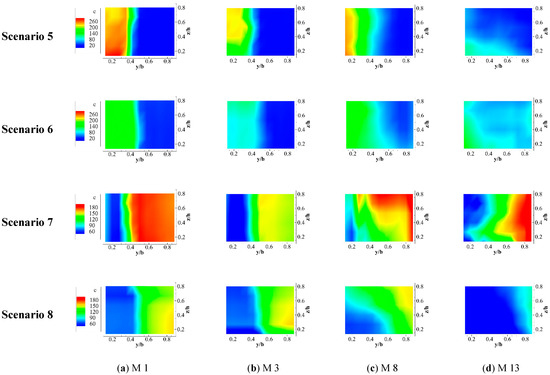In Scenarios 5 and 6, a high pollution concentration zone appears near the left bank at M1 (see Figure 10). The contaminant zone, which contains a mixing layer and polluted water, is larger than that where q = 0.33, but the maximum concentration value is smaller. However, all the features are reversed when pollutant tracer is discharged by line source at the right branch. The high concentration pollution zone occurs close to the right bank at the confluence and downstream. The range of the contaminant zone and the maximum concentration value when q = 0.33 are both larger than those when q = 0.5. As the discharge ratio increases, with the constant discharge mode and emissions, the left branch’s flow and momentum augment due to the smaller of cross section. At M3, the maximum concentration of the contaminant band disappears and the concentration is redistributed because the water flows interchange and blend with each other after the intersection. At M8, the high concentration contaminant zone reappears and it blends into the center downshift due to the counter-secondary flow (see Figure 8). The pollutants are basically mixed up evenly by M13. Therefore, when contaminant is discharged from the left branch, the identification and treatment of pollutants will be better in the small discharge ratio. On the contrary, when the confluence ratio is larger, the identification and treatment of pollutants will be better when the discharge of pollutants is from the right branch.