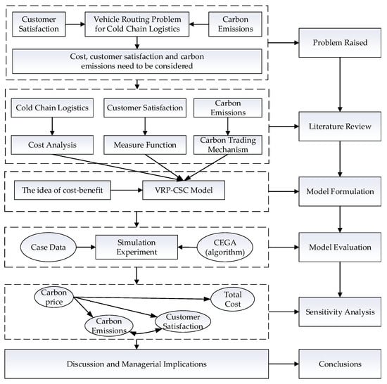 In summary, there is still little research on cold chain transportation that considers the three factors of economy, customer satisfaction, and environment at the same time. Thus, this paper proposes a comprehensive VRP-CSC model (vehicle routing problem for cold chain logistics considering customer satisfaction and carbon emissions) to optimize distribution paths. In order to minimize the total costs, including the carbon emissions costs, and maximize customer satisfaction, based on the idea of cost–benefit [39,40], this model adopts the ratio of cost to customer satisfaction as the objective function, instead of minimization of the total costs. Detailed design processes of the objective function in this paper are shown in Section 3.2. Because China is setting up a national carbon trading market, the carbon trading mechanism was introduced into this model to calculate carbon trading costs.